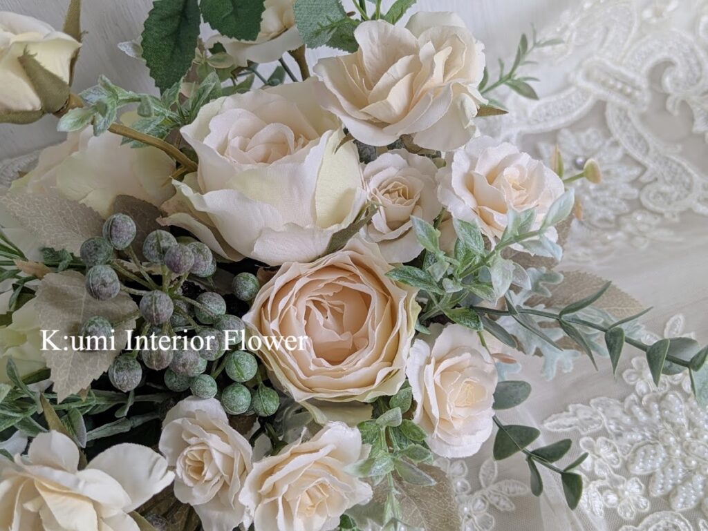 アンティークガラスの器から溢れるような白だけの美しい花々。